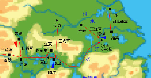 という、6方面からの侵入に中軍が襄陽に駐屯という最大級の陣容である。晋軍の陣容 侵攻方面 対応した呉軍 都督徐州諸軍事・司馬伷 下邳→建業 不明 都督揚州諸軍事・王渾