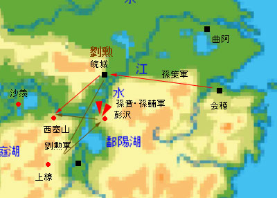 - (注)李術について。孫賁伝で書いたように、この戦いは荊州制圧のための序章に過ぎないので、孫策はここを統治する気はあまりない。ということで、部下を配置しなかった。おそらく李術は皖城の守将(あるいは寝返った部将)であり、降伏した李術をそのまま太守として皖城に置いた。厳象殺害のための要員というのは面白い仮説だが、むしろ、劉勲が曹操の元に降っていることの方が、李術の厳象殺害と絡んでいる可能性の方が考えられる。